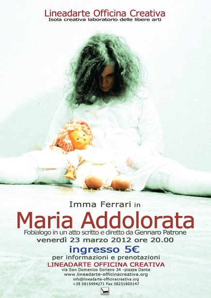 Il testo di Gennaro Patrone , nasce da un’ idea dell’ attrice Imma Ferrari , l’ autore ha cercato di tradurre drammaturgicamente, affrontando in punta di piedi , il tema della pedofilia….sono stati molti gli elementi e i quesiti che hanno dato il via alla scrittura di “Maria Addolorata” . Essa, si racconta in un “Fobialogo” atto unico , la protagonista vittima sacrificale di una mente perversa , mette a nudo la sua drammatica storia, lanciata in una piccola stanza di quattro pareti bianche, asettiche, vuote da qualsiasi elemento decorativo…soltanto le confessioni e le parole di Maria Addolorata saranno come pugni che fendono il vuoto, trasportandoci nel suo fobico tormentato inconscio , e dondolandoci su di una ironica altalena del suo consumato dramma. Lei metterà in scena quei fantasmi del passato che ancora le sfiorano quelle profonde ferite incurabili : Le sofferenze , le violenze , la mancanza d' amore , il desiderio di una famiglia e di un figlio , questi episodi rivivono deformati e confusi ormai radicati sulla sua pelle, nei suoi sguardi, nella sua mente, unica sua inseparabile compagna di viaggio è l’ inerme interlocutrice , il suo unico affetto, la sua piccola ...